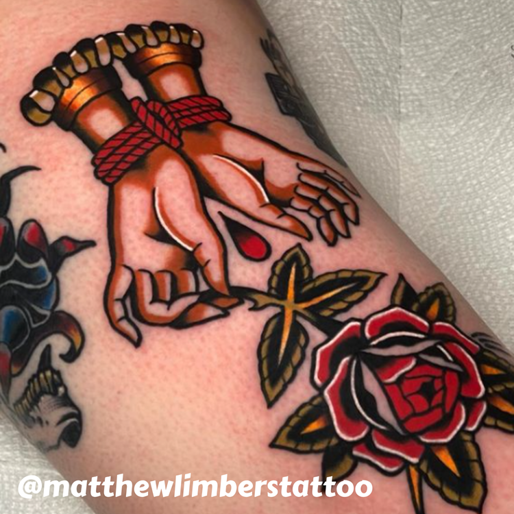 3. Vibrant Color Palette: A limited but bold palette of reds, blues, greens, yellows, and blacks is central to the aesthetic, ensuring visibility and contrast even as tattoos age.