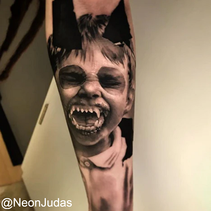 Common subjects in horror tattoos include skulls, zombies, vampires, witches, stitched flesh, demonic creatures, cursed dolls, haunted landscapes, or dripping, deformed figures. Some designs pay tribute to horror icons from film and literature, while others are entirely original, born from the artist’s own twisted imagination.