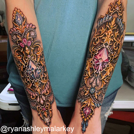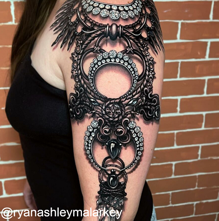 Color can vary depending on the artist and the desired effect. Black and gray jewelry tattoos offer a subtle and timeless look, while colored versions might use soft pastels, shimmering gold tones, or gemstone hues like sapphire blue or ruby red. White highlights are often added to simulate shine and sparkle, making the piece look as though it’s catching the light.