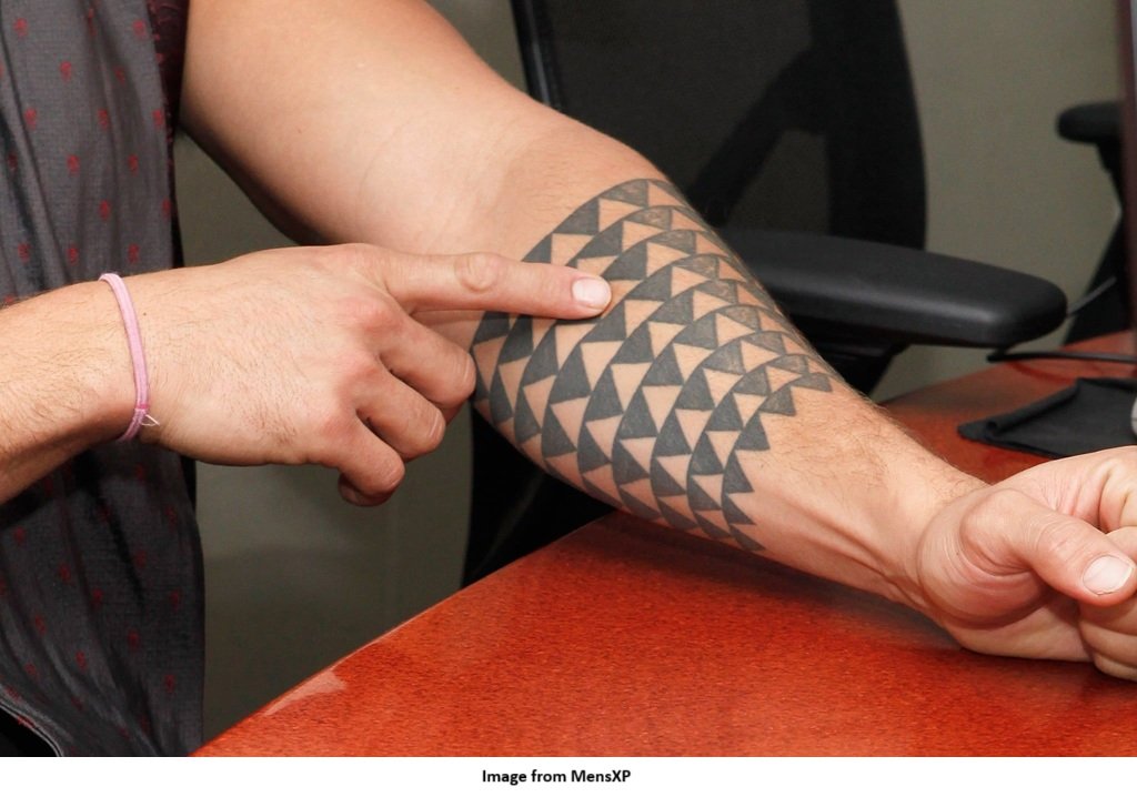 While he’s got more tattoos than you can count in a single viewing, our favorite is the forearm tattoo. According to Momoa, it represents interlacing shark teeth, symbolizing the spirit guardian of his family.