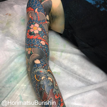 The flow of a tebori tattoo is highly intentional. Artists design each piece to move with the body’s natural curves — wrapping across the back, arms, or legs like a living mural. Background elements like wind bars, clouds, and waves help unify large pieces, often forming full sleeves or full-body suits that unfold over years of work.